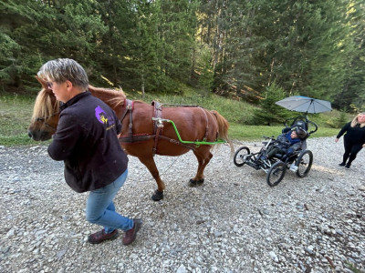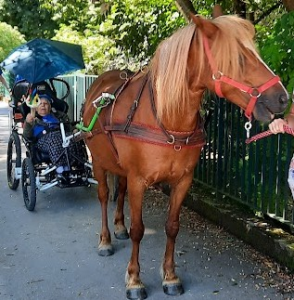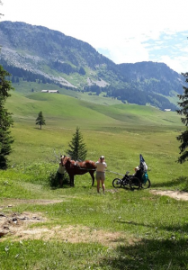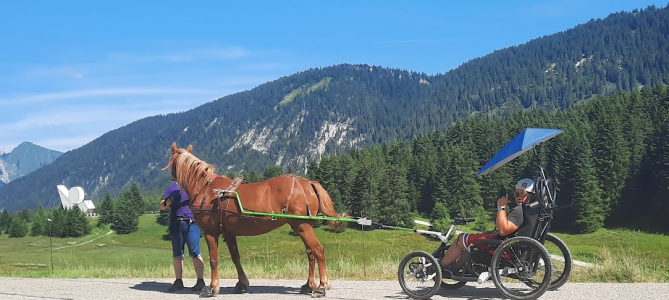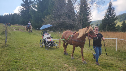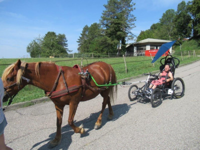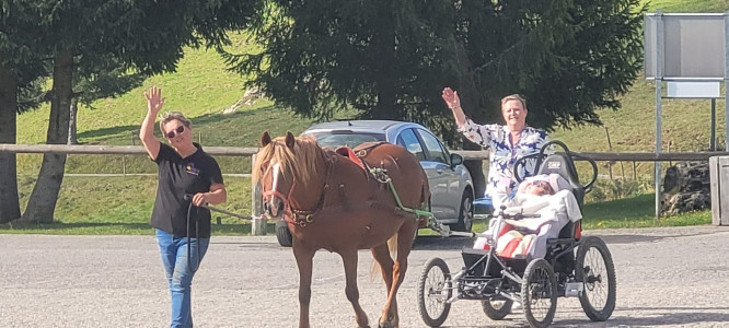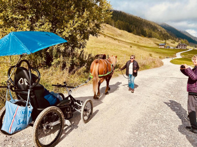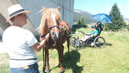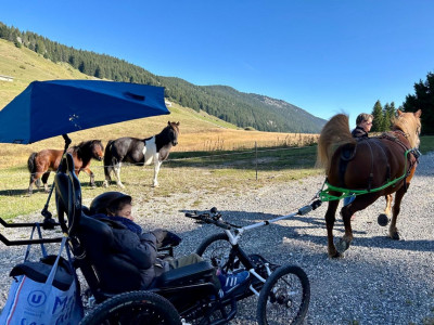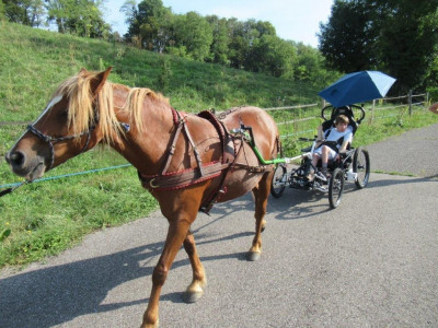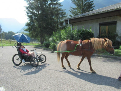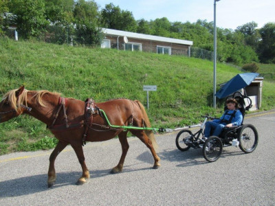 En partenariat avec l’association Handi Lac & Montagnes, nous avons un engin de ce type à notre disposition que nous avons choisi d’utiliser en traction équine.