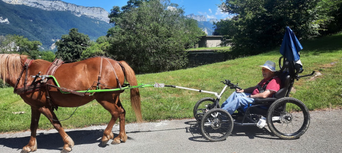Cet «équimobile» a été conçu afin de permettre aux personnes à mobilité réduite de participer aux randonnées avec un groupe de marcheurs, quelques soient leurs capacités physiques ou intellectuelles. En effet, c’est le cheval qui tracte et donc dirige le fauteuil. Il n’y a donc pas besoin de tenir le guidon.